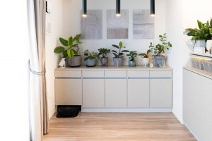 すきまくんシリーズで大好評のシルクベージュ色のオーダー家具です。カウンター下すきまくんをベースに部屋の巾ピッタリにオーダーしました。ライトにグリーン植物が映えてとても素敵なインテリアになりました。もちろん収納力も抜群です\(^o^)/