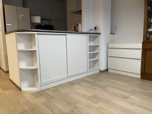 「ジャストサイズのカウンター下収納家具をネットで探していてこちらのホームページを見つけました。幅を調整できるのが引出と配線キャビネットしかなくオープンのキャビネットの見積もりを依頼しました。すると翌日には図面付きで見積もりが来て納得のいく価格だったので即決し発注しました。ついでなのでカウンター下の他に探していた引出キャビネットも3Dすきまくんでジャストサイズでお願いしました。色見本いただいて検討したので、色・質感も思った通り、もちろんサイズもぴったりです。作りもしっかりしていて長持ちしそう!引戸・引出の動きもスムーズでこれから使っていくのが楽しみです。」ありがとうございます!弊社の家具は何十年も使っていただけます。すきまくんをよろしくお願いいたします\(^o^)/