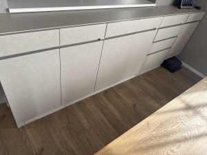 『お掃除ロボットの存在感が大きかったのですがそれをカウンター下収納の中に隠すことが出来たこと、収納数が増えた事に喜びを感じています。丁寧な対応、計算された設計に大満足です』嬉しいお便りありがとうございました。最近はお掃除ロボット収納型の特注の注文を沢山頂いてます\(^o^)/右下のロボットくんは奥までキチっと入り充電してくれます。