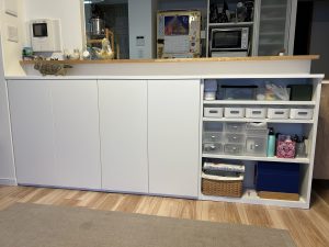 『フルオーダー家具の店で見積りを取ったものの、最低でも30万円はかかるとのことで悩んでいたところ、SNSで“すきまくん”を知り、そこから検索してs-factryさんのオーダー家具を知りました。当方の希望をメールでお伝えすると、あっという間に図面を作成していただき、そこから当方の要望に合わせて細部を修正していただきました。全てメールのやり取りでしたが、とても丁寧でスムーズでした。設置場所に入るかどうかも事前採寸もお願いしたのですが、採寸に来て下さった方から当方の希望通りにした場合の不具合なども指摘して頂けて満足な仕上がりにすることができました。値段も要望をお伝えしても20万円以内に収まったので本当にありがたかったです。キッチンカウンター下にピッタリ収まる棚ができたことで、今まで住所の決まっていなかったものの置き場所が確定して、片付けもしやすくなり、部屋全体が洗練されたように感じています。またテレビ台及びその横の収納なども相談させていただきたいと思います。今回は本当にありがとうございました。』お役にたてて何より嬉しいです\(^o^)/